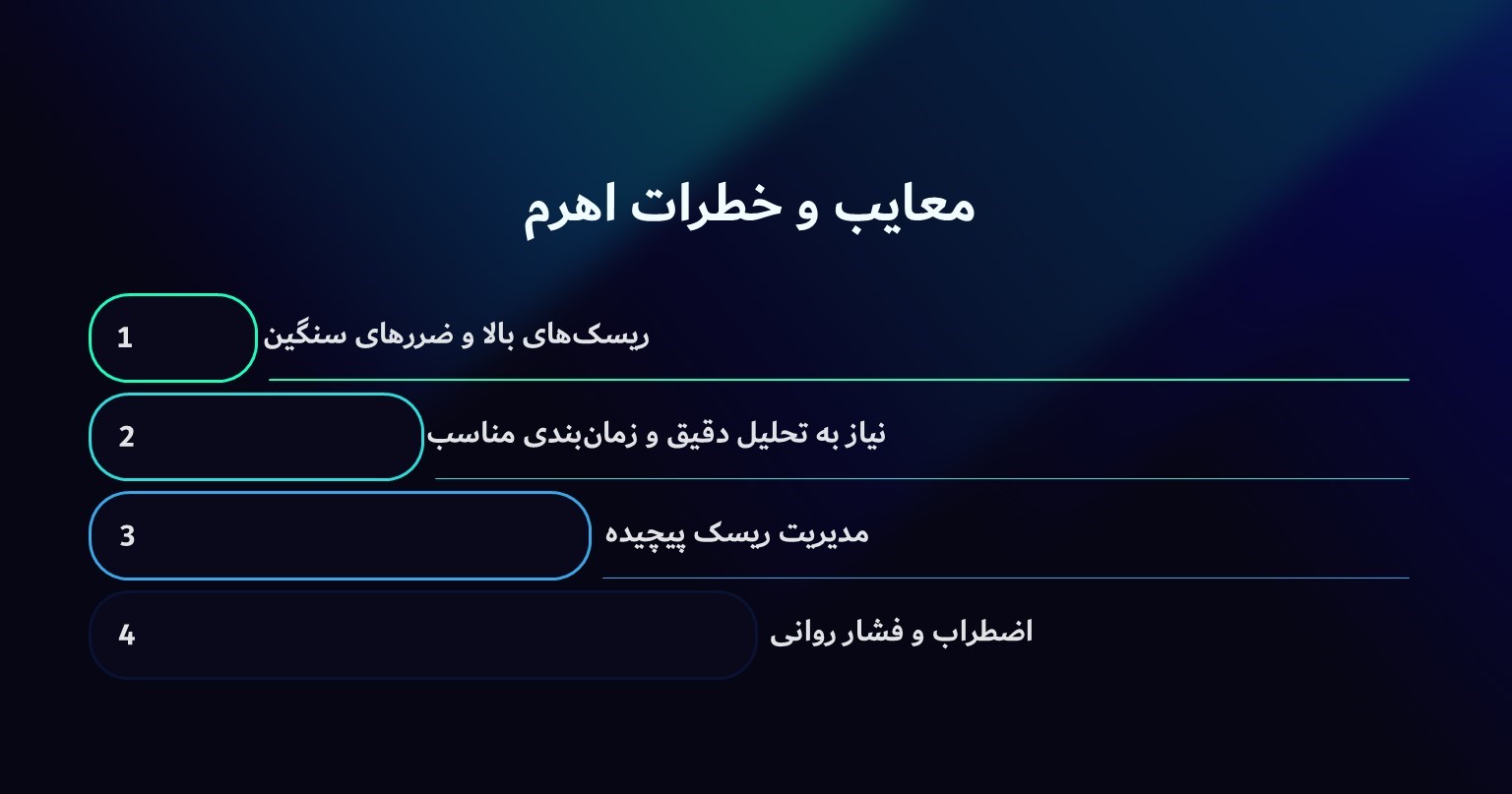 نکته: اگر نوسانات قیمت بر خلاف پیشبینی شما حرکت کند، خطرات این نوع معاملات میتواند بسیار بالاتر از معاملات بلندمدت باشد. همچنین، انجام معاملات مداوم نیازمند دقت بالا و استراتژیهای دقیق است، و به همین دلیل ممکن است تازهکارها به راحتی در این نوع استراتژیها شکست بخورند.